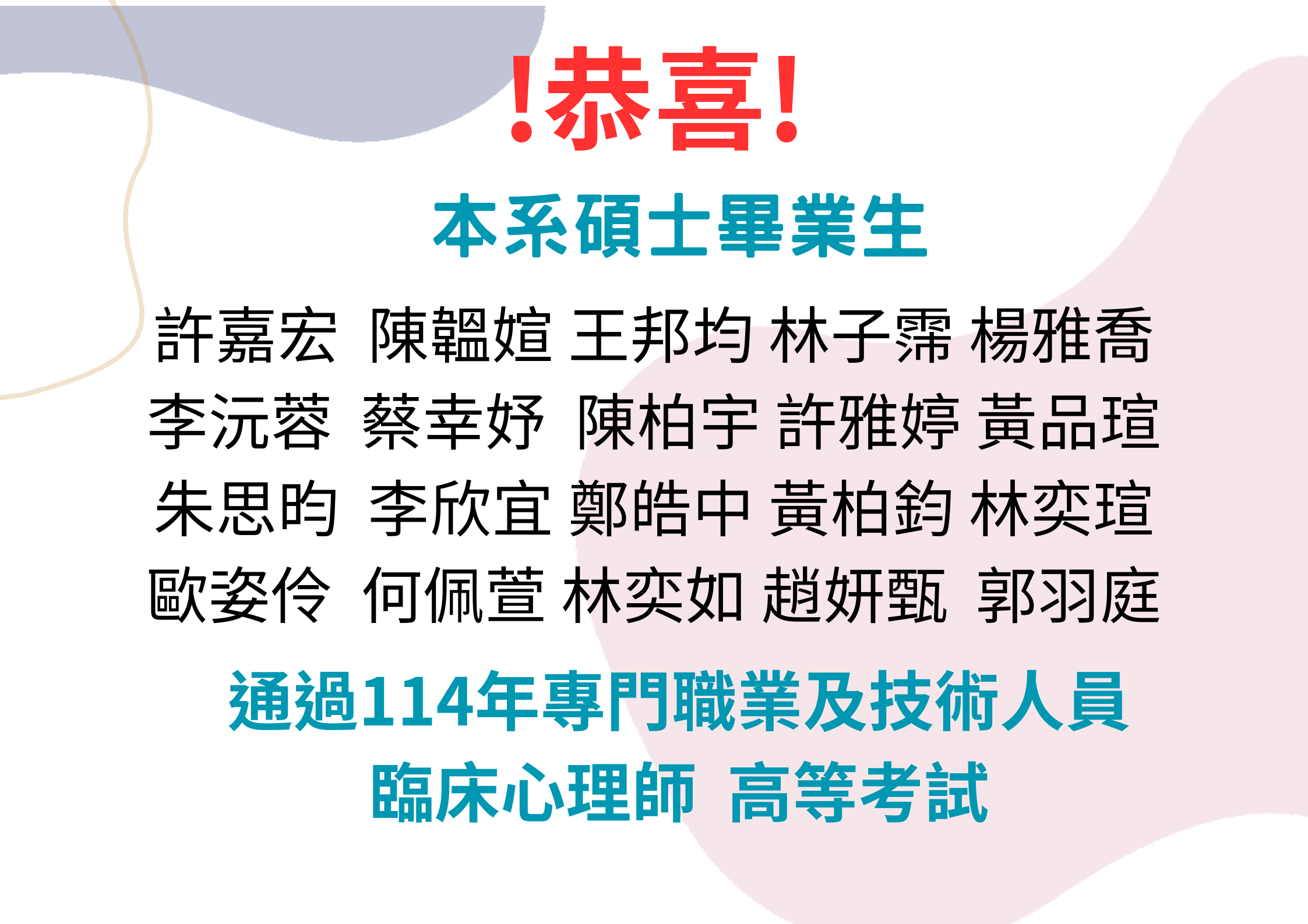 [榮譽榜]恭喜!本系114年臨床心理師考照率100%