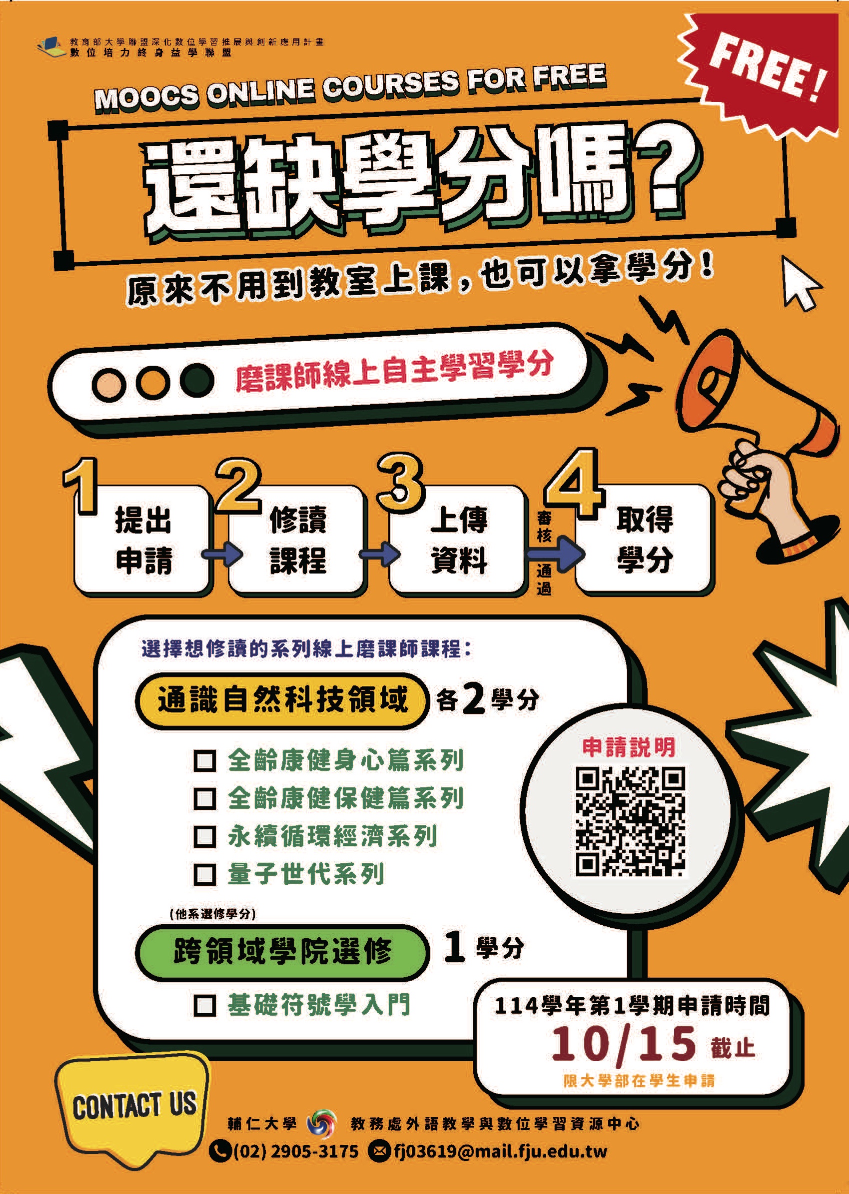 2025/10/01 08:51 [一般公告]函知114學年第一學期「磨課師自主學習課程」申請事宜,自即日起至114年10月15日(三)截止收件