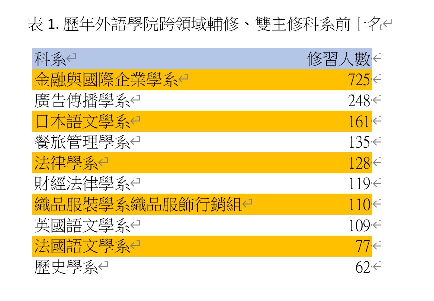 2)日文系名列輔大修習輔系、雙主修人數最多前3名科系