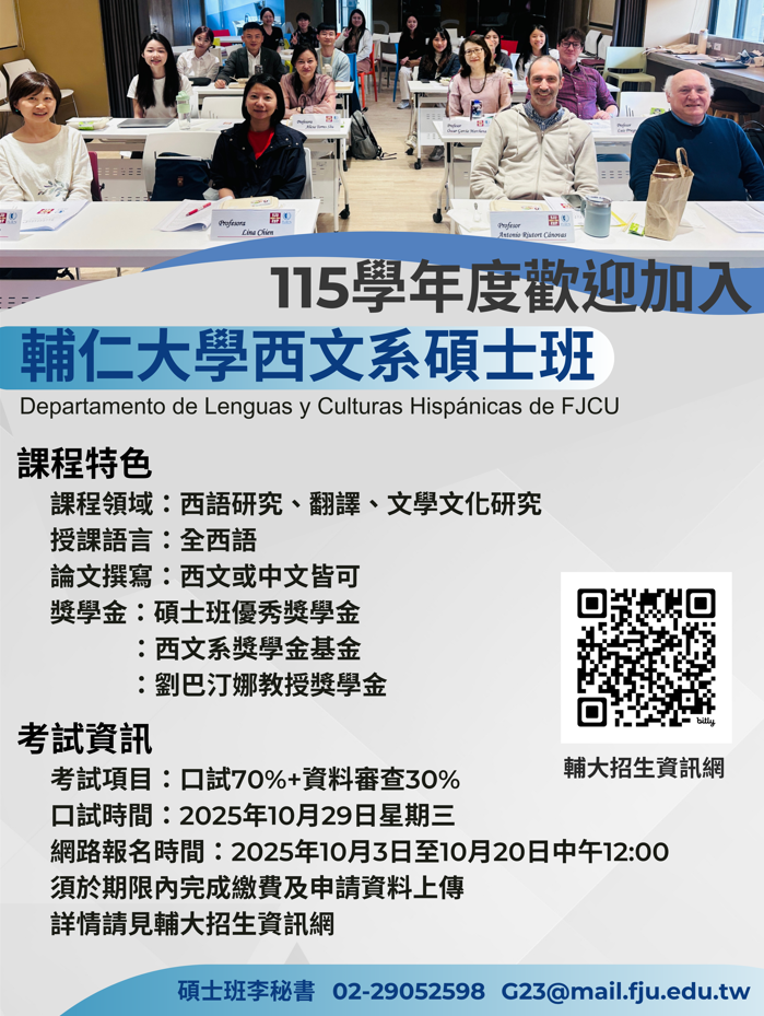 2025/10/03 11:26 [碩班招生公告]115學年度輔大西文系碩士班甄試招生考試資訊公告